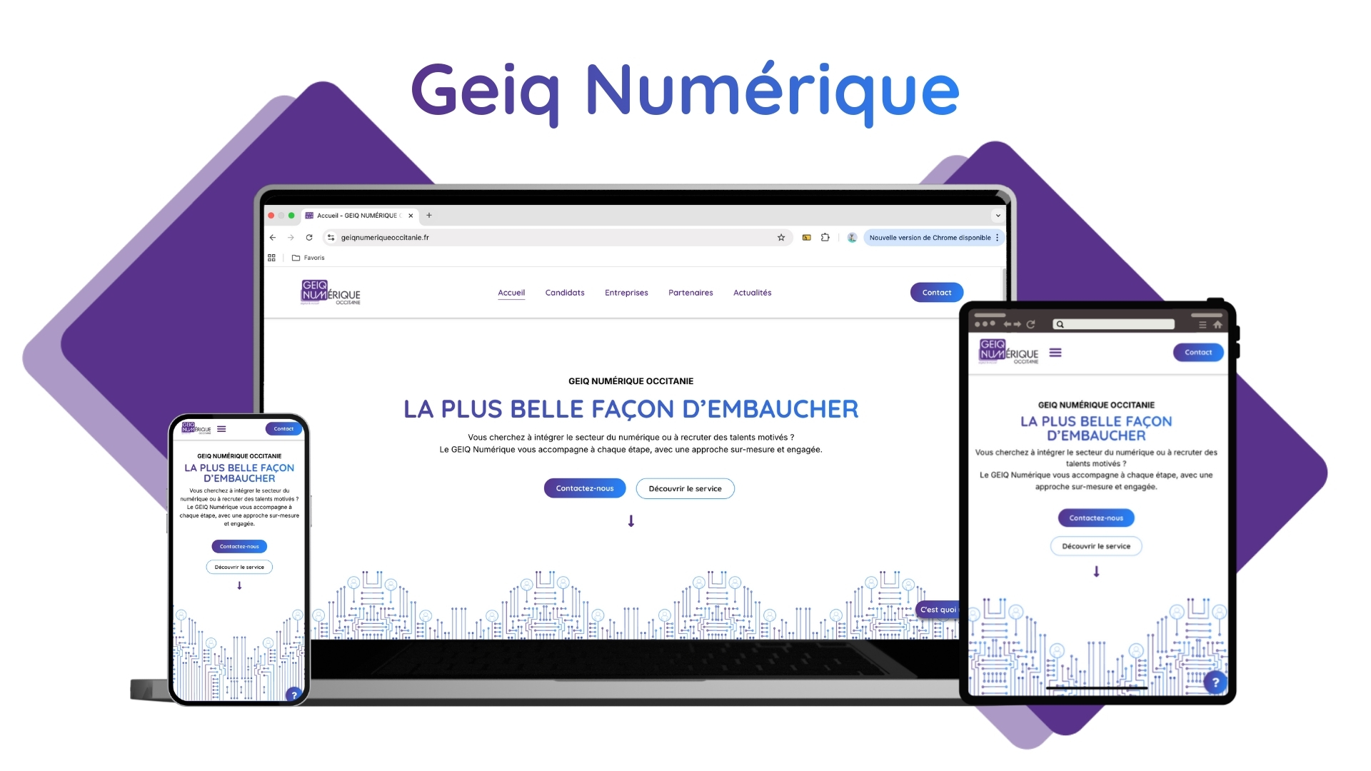 Le GEIQ Numérique Occitanie est un groupement d’employeurs qui facilite l’insertion et la qualification de personnes éloignées de l’emploi dans les métiers du numérique. Leur site web avait besoin d’un second souffle, à la fois sur le plan graphique, structurel et stratégique.