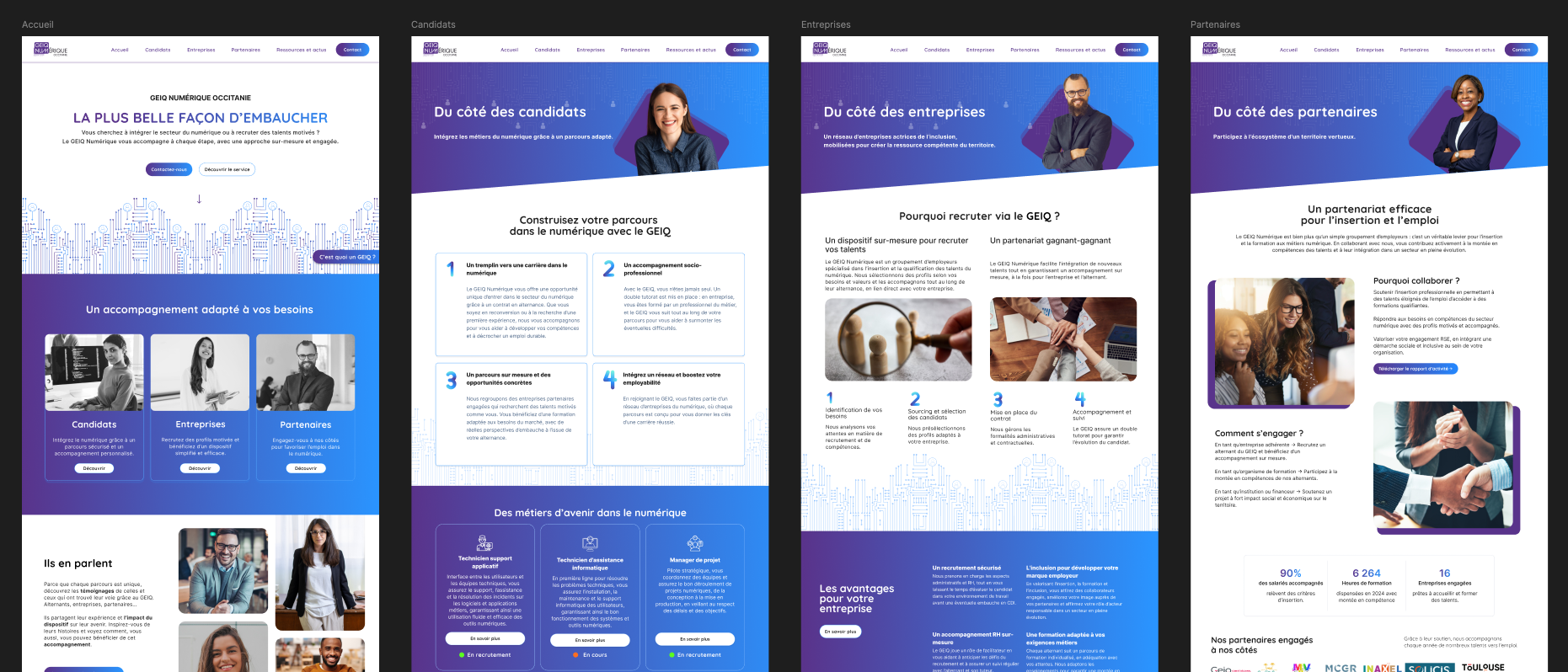 Le GEIQ Numérique Occitanie est un groupement d’employeurs qui facilite l’insertion et la qualification de personnes éloignées de l’emploi dans les métiers du numérique. Leur site web avait besoin d’un second souffle, à la fois sur le plan graphique, structurel et stratégique.