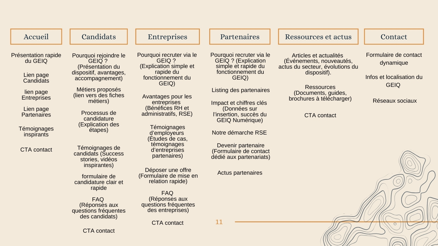Chaque parcours a été pensé pour répondre rapidement aux questions clés, rassurer, guider et inciter à l’action, tout en valorisant l’impact social du GEIQ.
